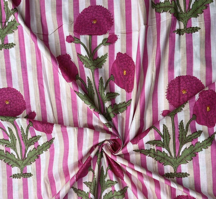 Baumwollstoff - Indien - blockprint Handdruck Blumen Streifen pink creme grün - 50 cm