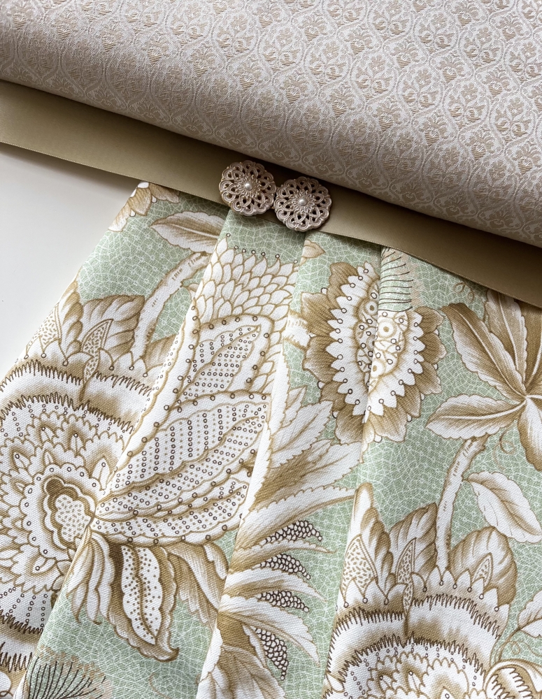 180 cm Rockstoff - Ornamentdruck mit großem Muster in lindgrün sandgold (2 rapportgleiche Stücke mit jeweils 90 cm)