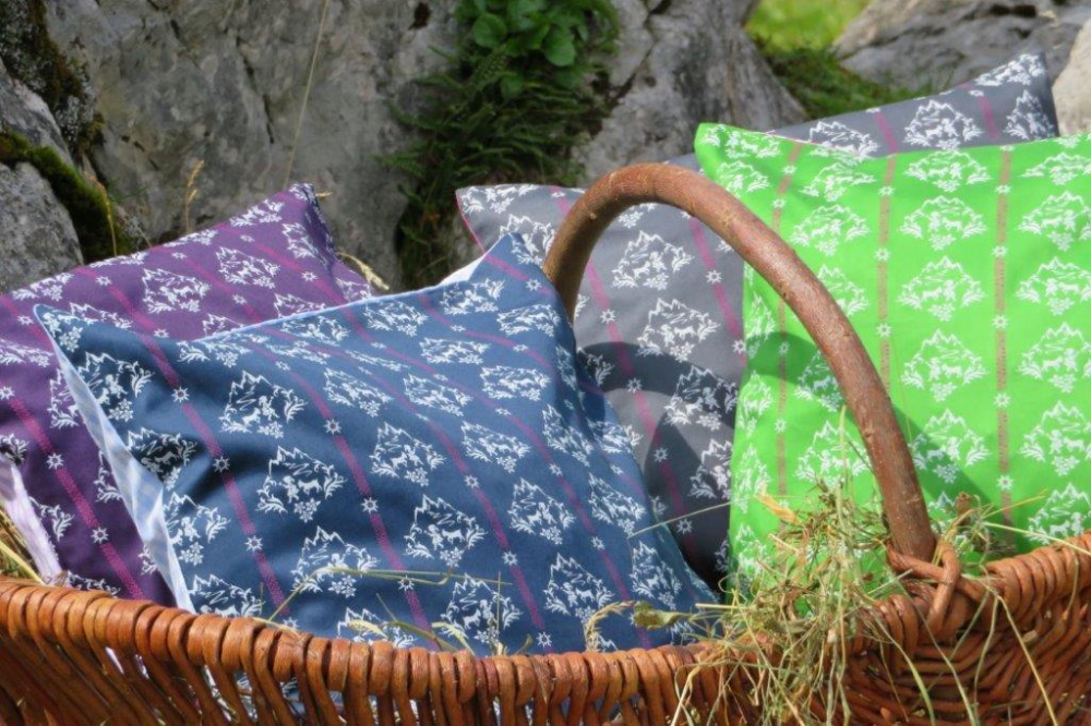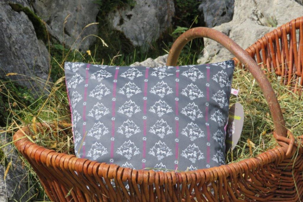 Kissenhülle mit Alm-Madl Motiv grau