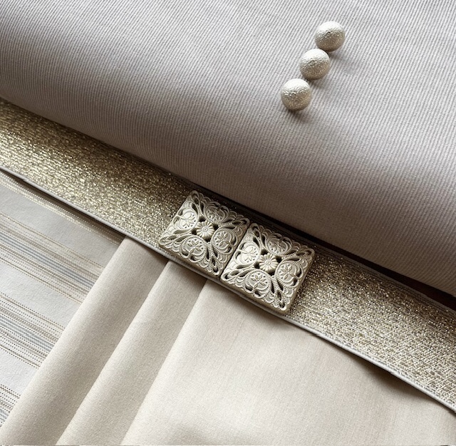 150 cm Rockstoff - cremefarbener italienischer Streifenstoff, Querstreifen mit goldenen Akzenten (2 rapportgleiche Stücke mit jeweils 75 cm)
